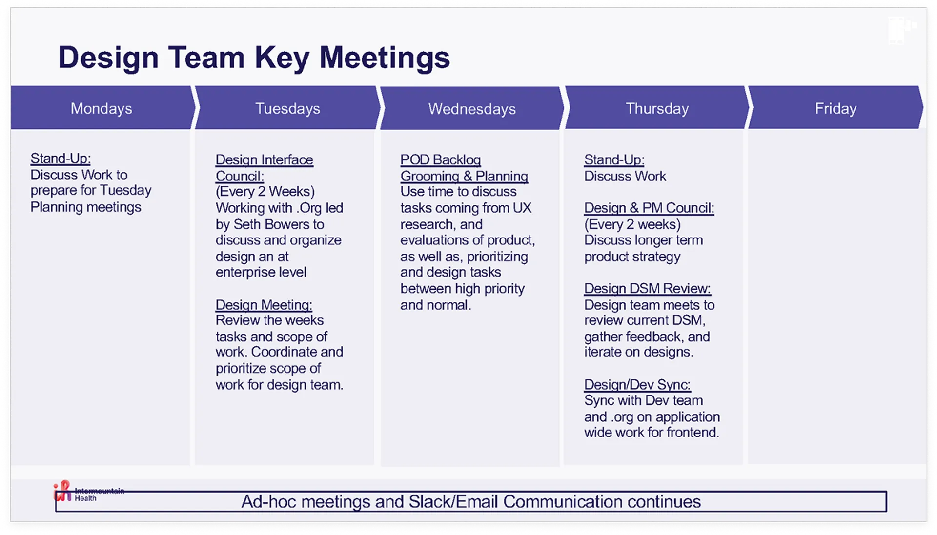 Process Design Lead, responsible for developing the framework, creating templates and tools, training the design team, and ensuring organization-wide adoption across all healthcare design projects.